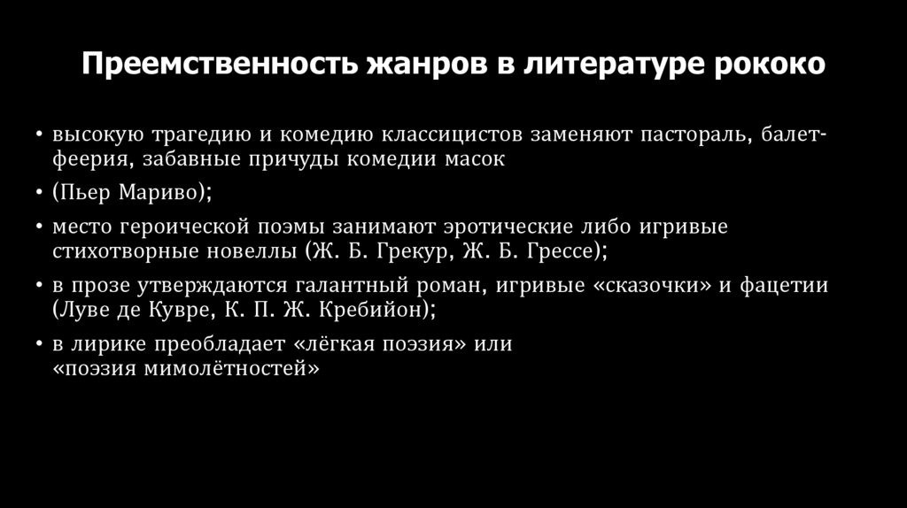 • высокую трагедию и комедию классицистов заменяют пастораль, балетфеерия, забавные причуды комедии масок• (Пьер Мариво);