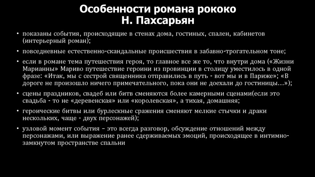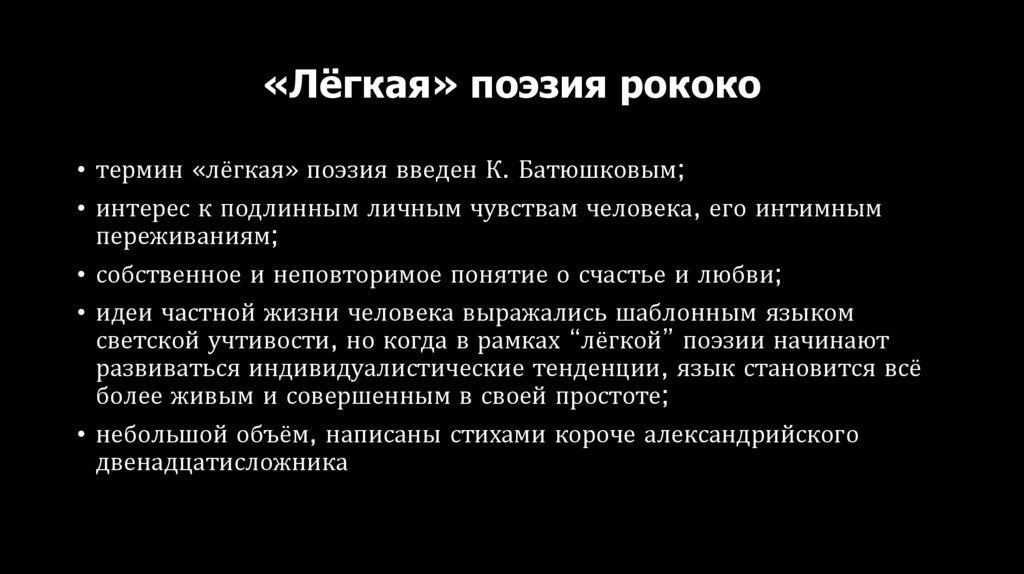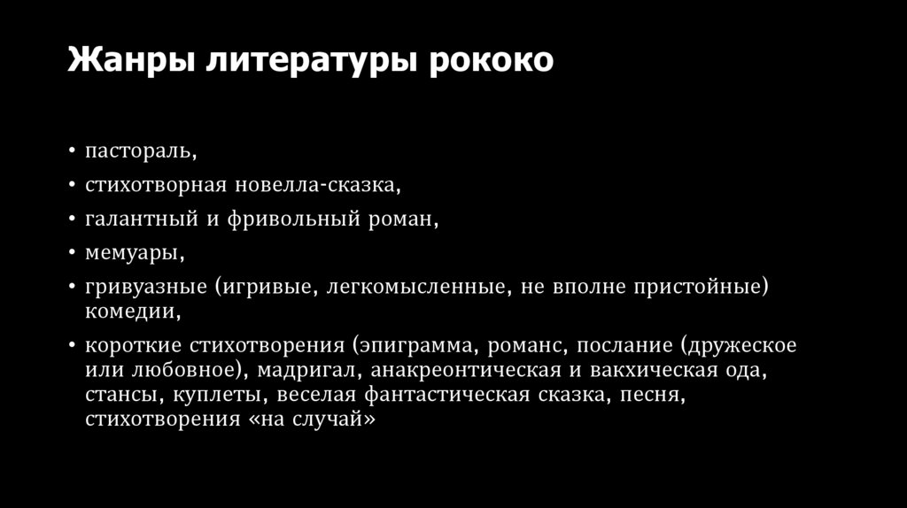 • нет места героизму и долгу;• царят галантная игривость, фривольная беззаботность;