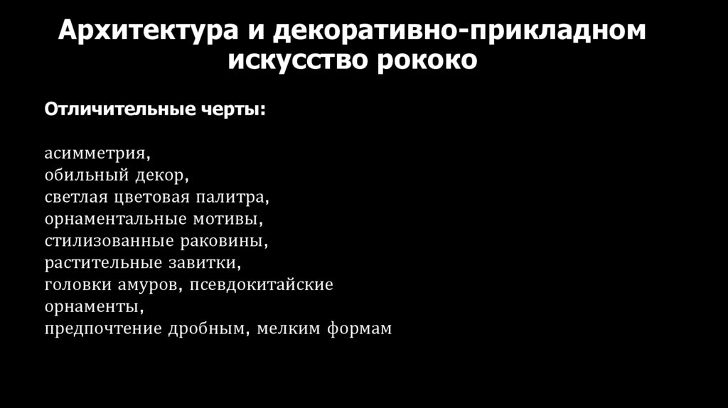 • декоративная перегруженность, пышность (как в барокко, но менее монументально и