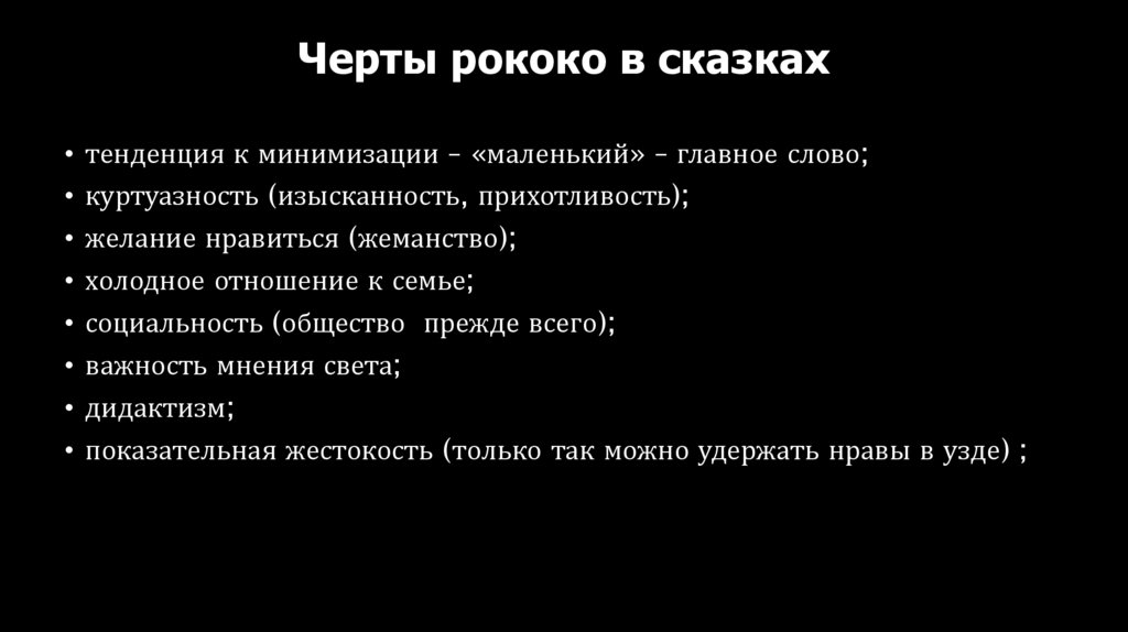 • тенденция к минимизации – «маленький» – главное слово;• куртуазность (изысканность, прихотливость);