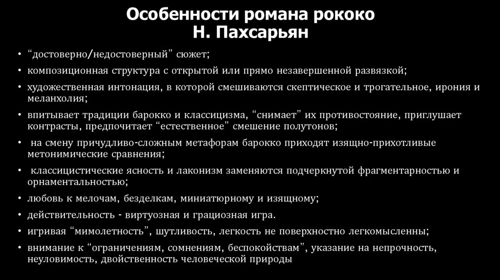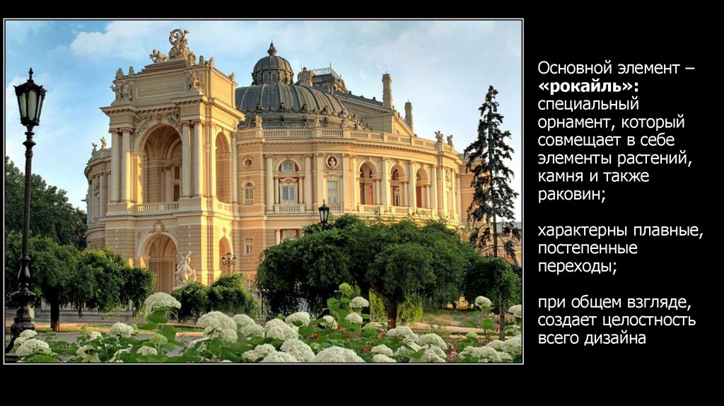 • впитывает традиции барокко и классицизма, “снимает” их противостояние, приглушает