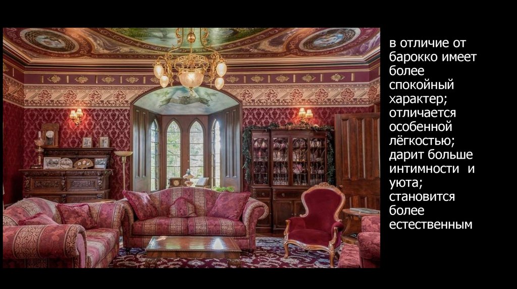 5. в отличие от барокко имеет более спокойный характер; отличается особенной лёгкостью; дарит больше интимности и уюта; становится