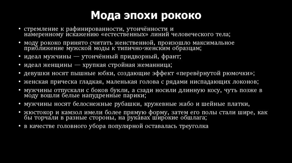 • стремление к рафинированности, утончённости инамеренному искажению «естественных» линий человеческого тела;
