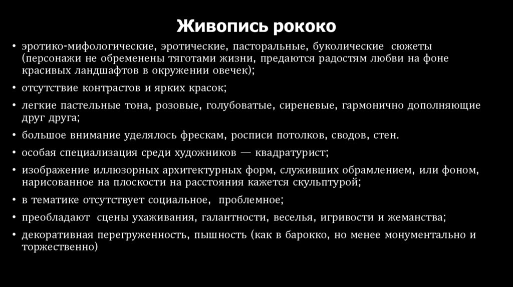 • эротико-мифологические, эротические, пасторальные, буколические сюжеты(персонажи не обременены тяготами жизни, предаются радостям любви на фоне