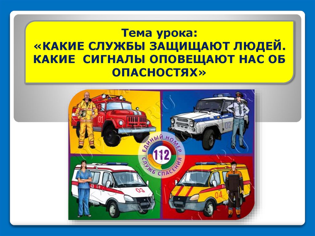 2. Тема урока: «КАКИЕ СЛУЖБЫ ЗАЩИЩАЮТ ЛЮДЕЙ. КАКИЕ СИГНАЛЫ ОПОВЕЩАЮТ НАС ОБ ОПАСНОСТЯХ»