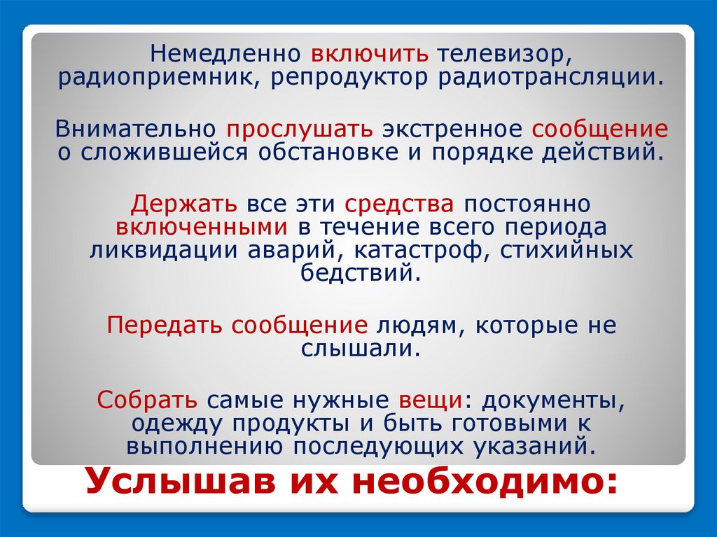 Немедленно включить телевизор,радиоприемник, репродуктор радиотрансляции.