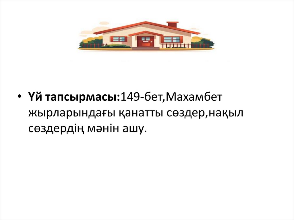 • Үй тапсырмасы:149-бет,Махамбетжырларындағы қанатты сөздер,нақыл