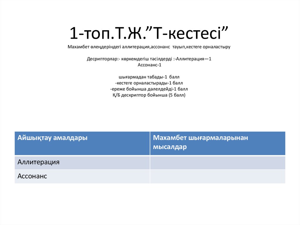 8. 1-топ.Т.Ж.”Т-кестесі” Махамбет өлеңдеріндегі аллитерация,ассонанс тауып,кестеге орналастыру Десрипторлар:- көркемдегіш