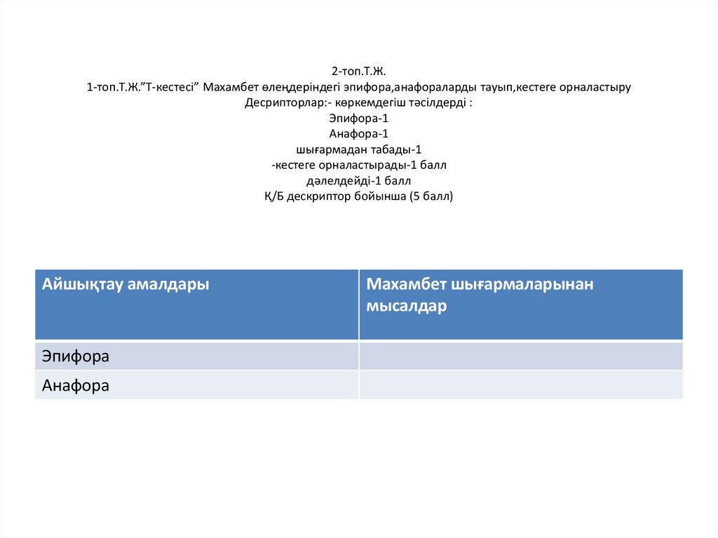 9. 2-топ.Т.Ж. 1-топ.Т.Ж.”Т-кестесі” Махамбет өлеңдеріндегі эпифора,анафораларды тауып,кестеге орналастыру Десрипторлар:-