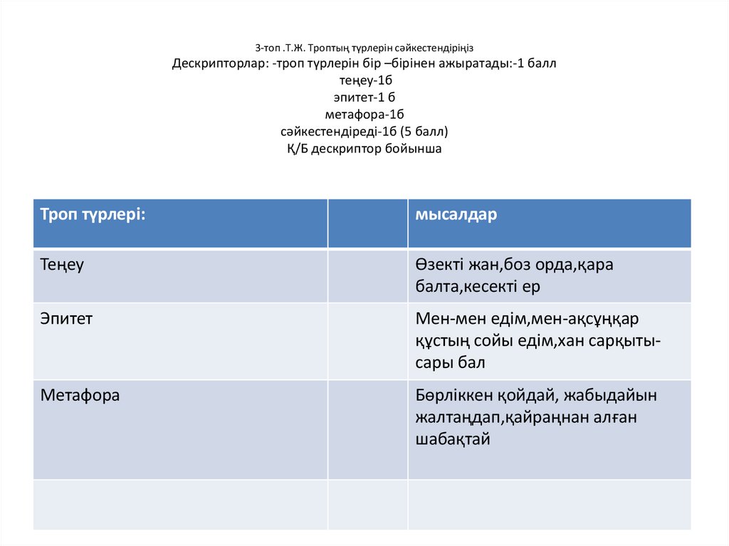 10. 3-топ .Т.Ж. Троптың түрлерін сәйкестендіріңіз Дескрипторлар: -троп түрлерін бір –бірінен ажыратады:-1 балл теңеу-1б эпитет-1 б