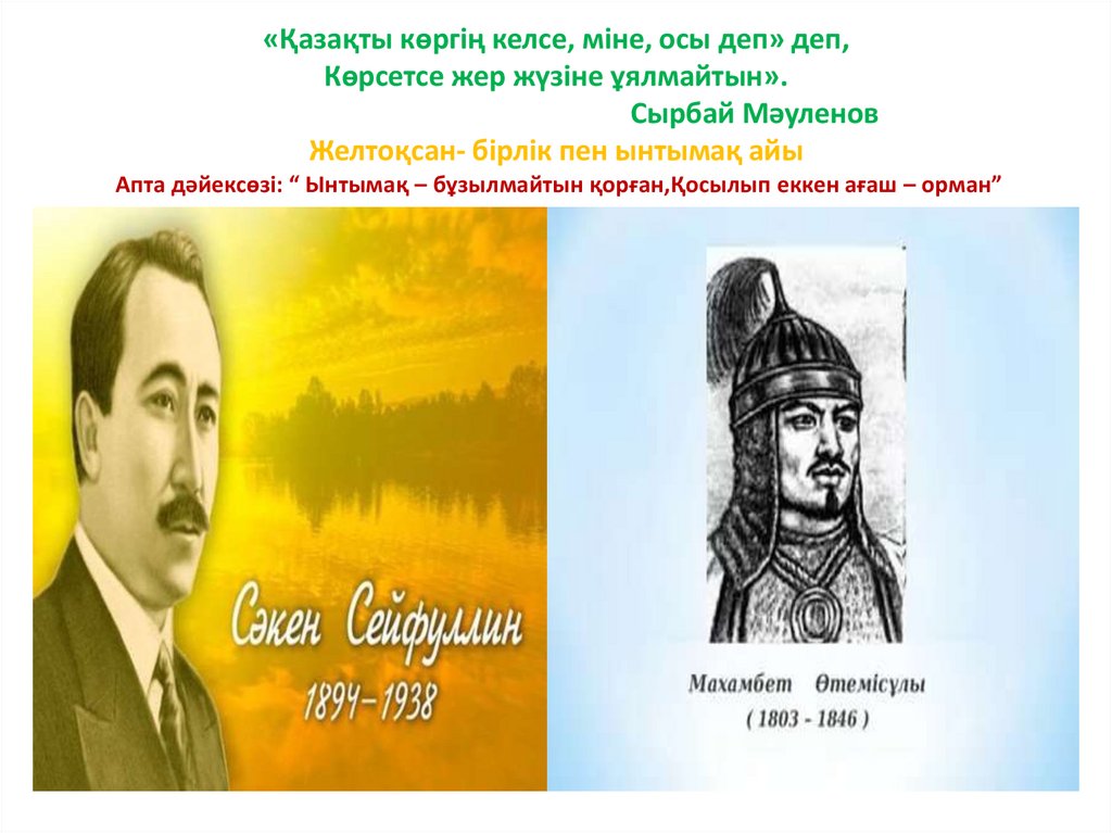 Апта дәйексөзі: “ Ынтымақ – бұзылмайтын қорған,Қосылып еккен ағаш – орман”