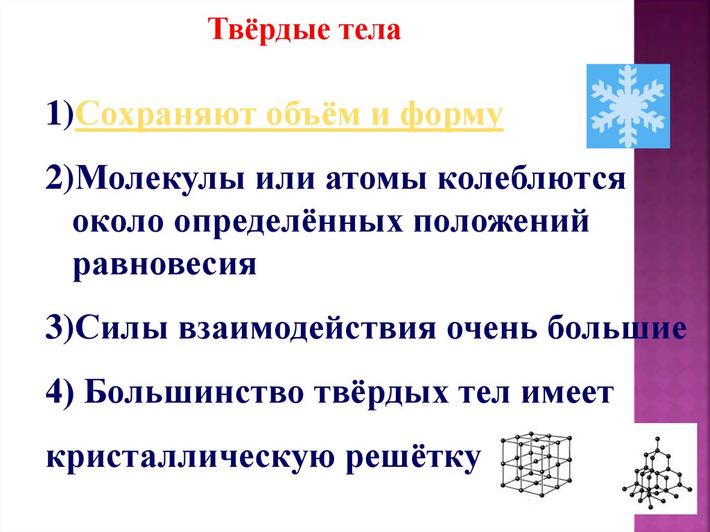 Твёрдые тела1)Сохраняют объём и форму
