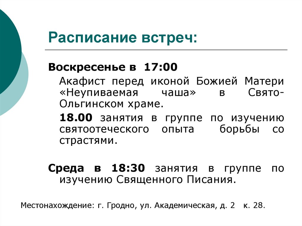проповеди, занятия в группе по изучению Св. Писания