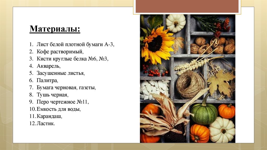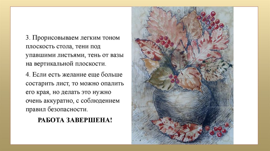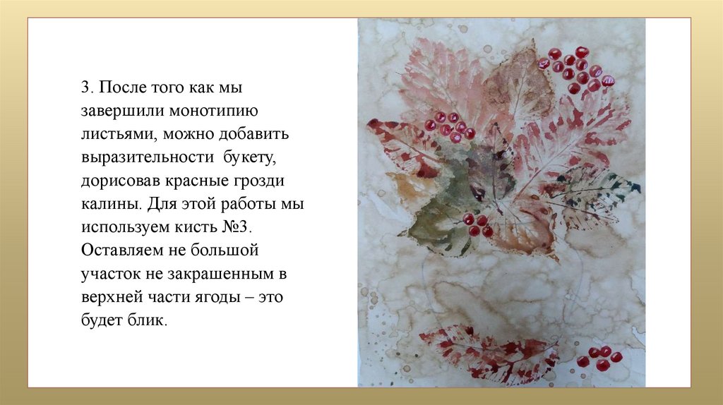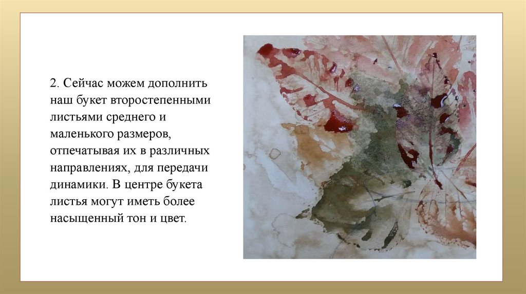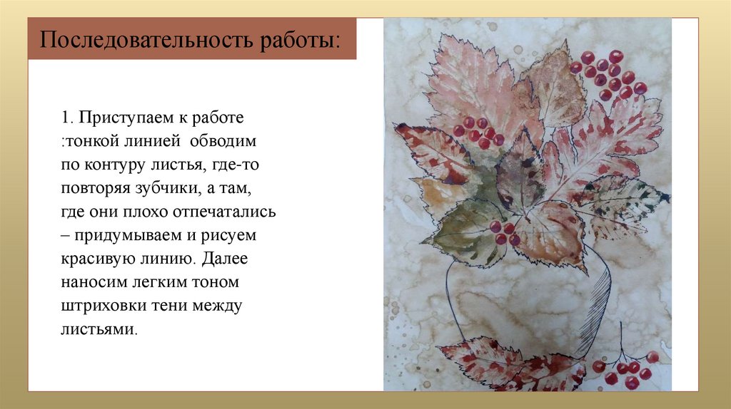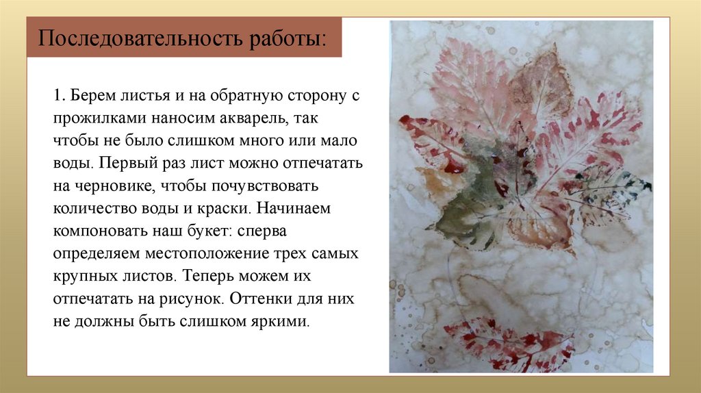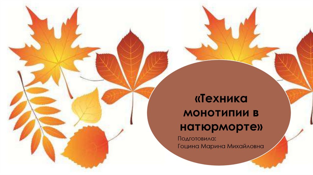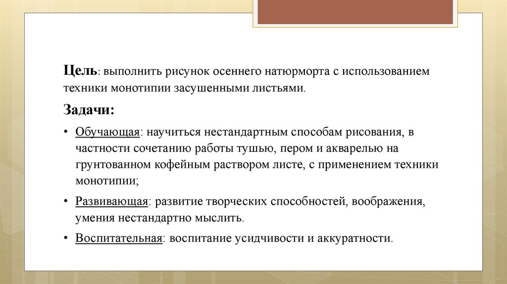 Цель: выполнить рисунок осеннего натюрморта с использованиемтехники монотипии засушенными листьями.