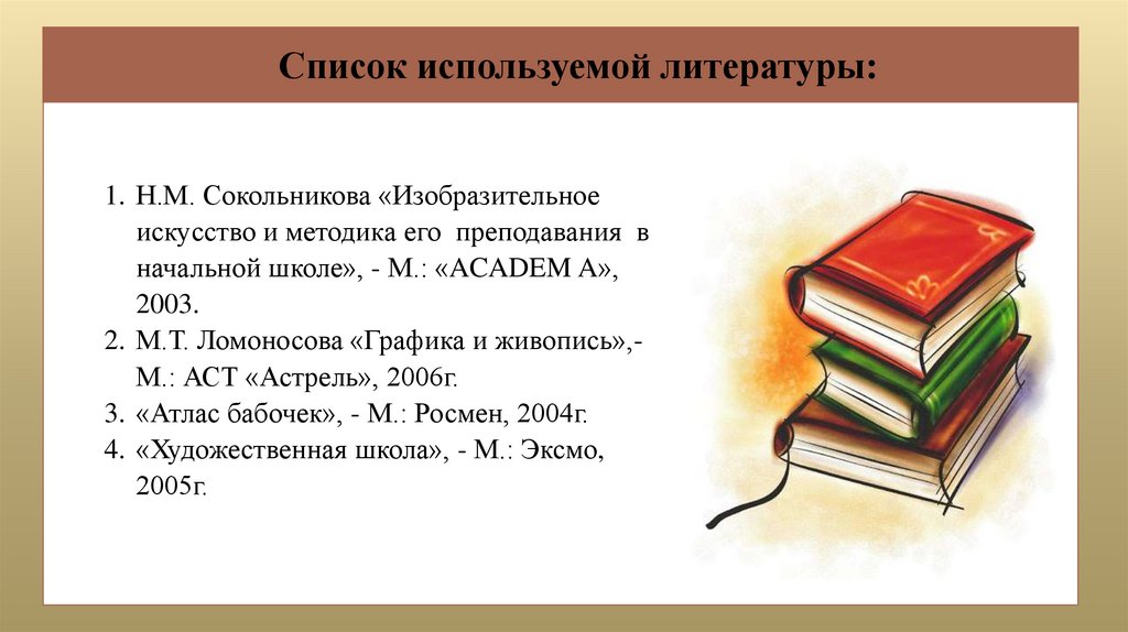 Список используемой литературы:1. Н.М. Сокольникова «Изобразительное