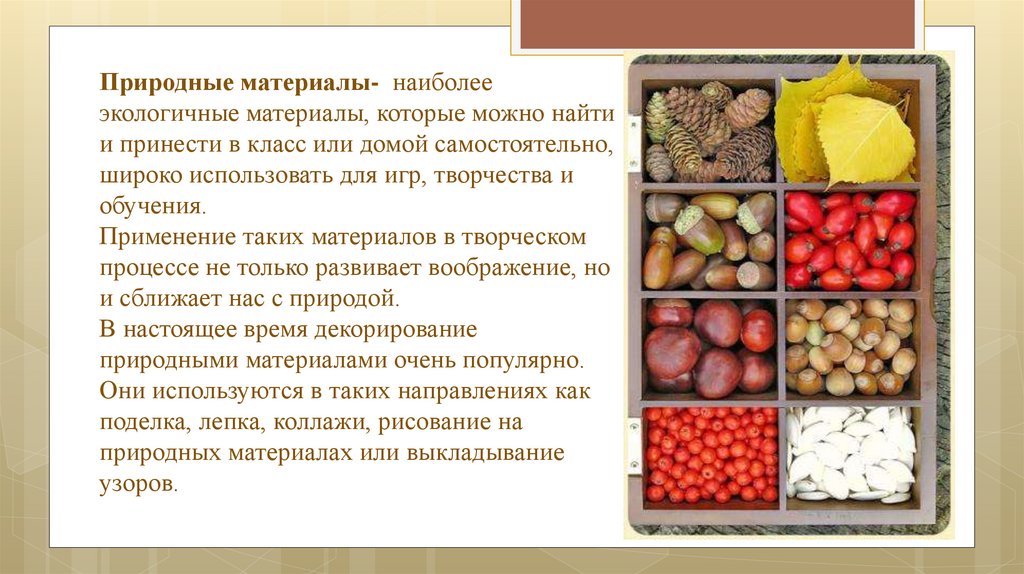 4. Природные материалы- наиболее экологичные материалы, которые можно найти и принести в класс или домой самостоятельно, широко