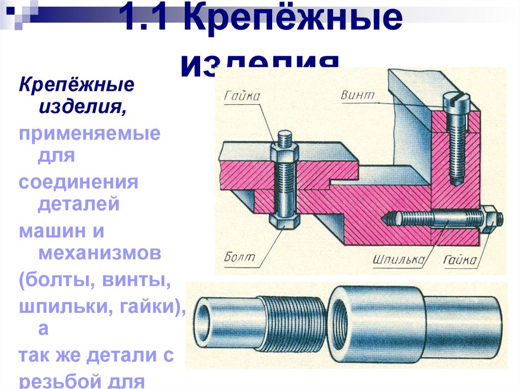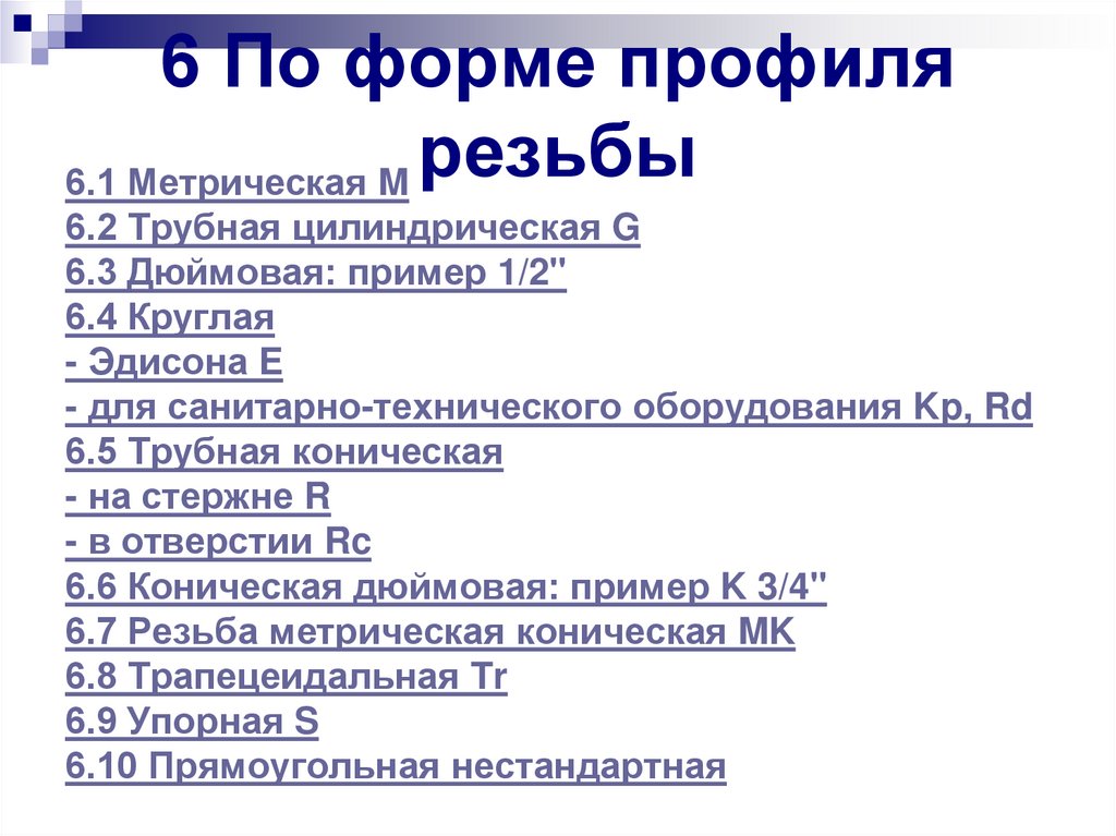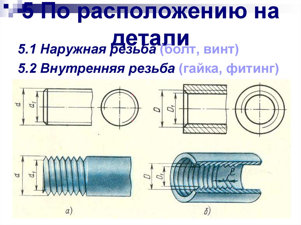 5.1 Наружная резьба (болт, винт)5.2 Внутренняя резьба (гайка, фитинг)