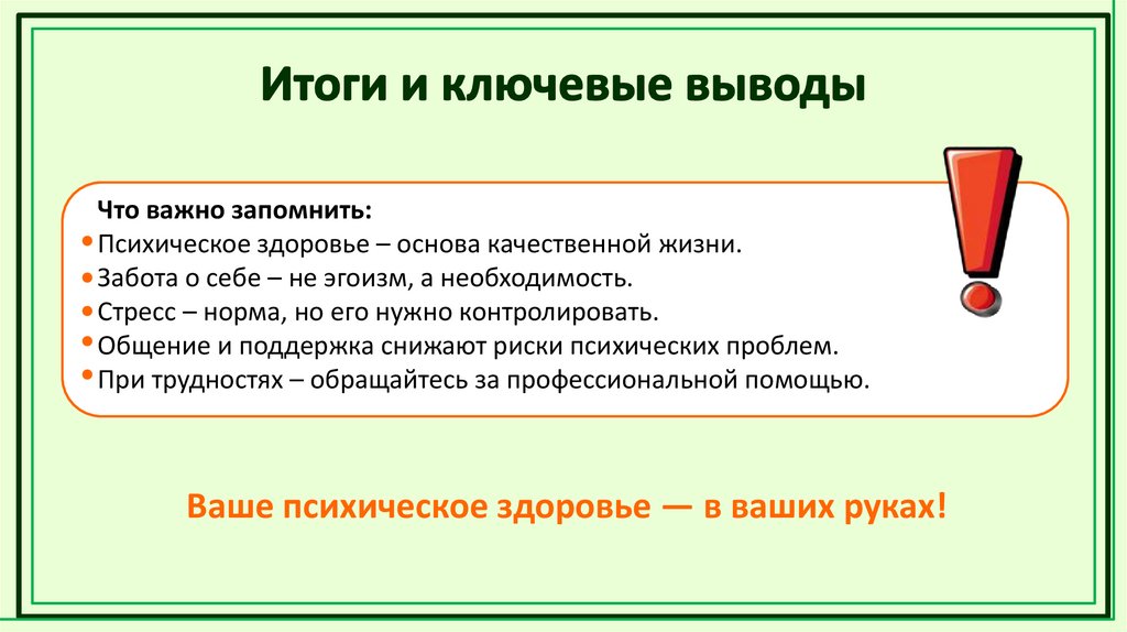 Что важно запомнить:Психическое здоровье – основа качественной жизни.
