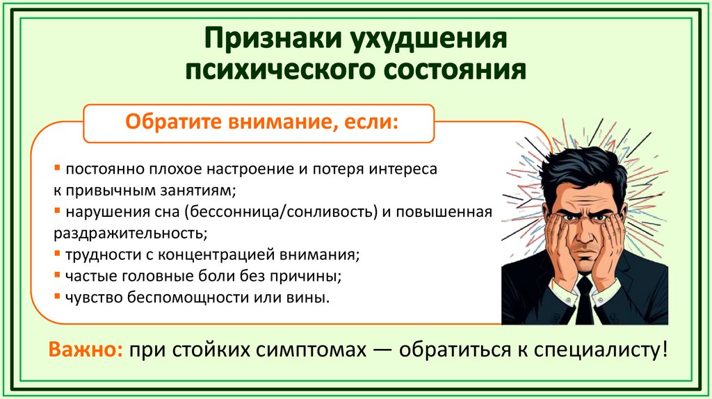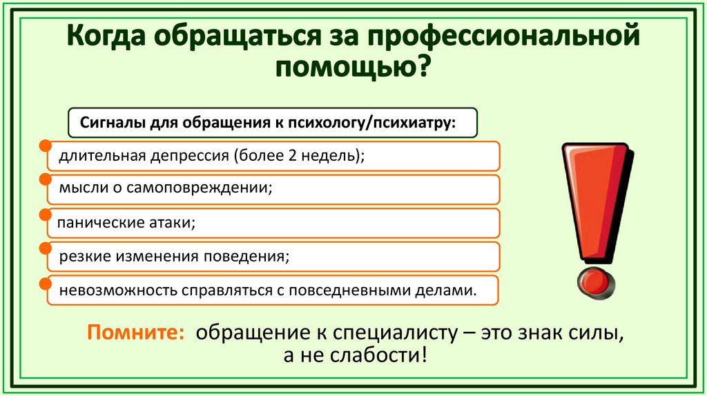 Сигналы для обращения к психологу/психиатру:длительная депрессия (более 2 недель);