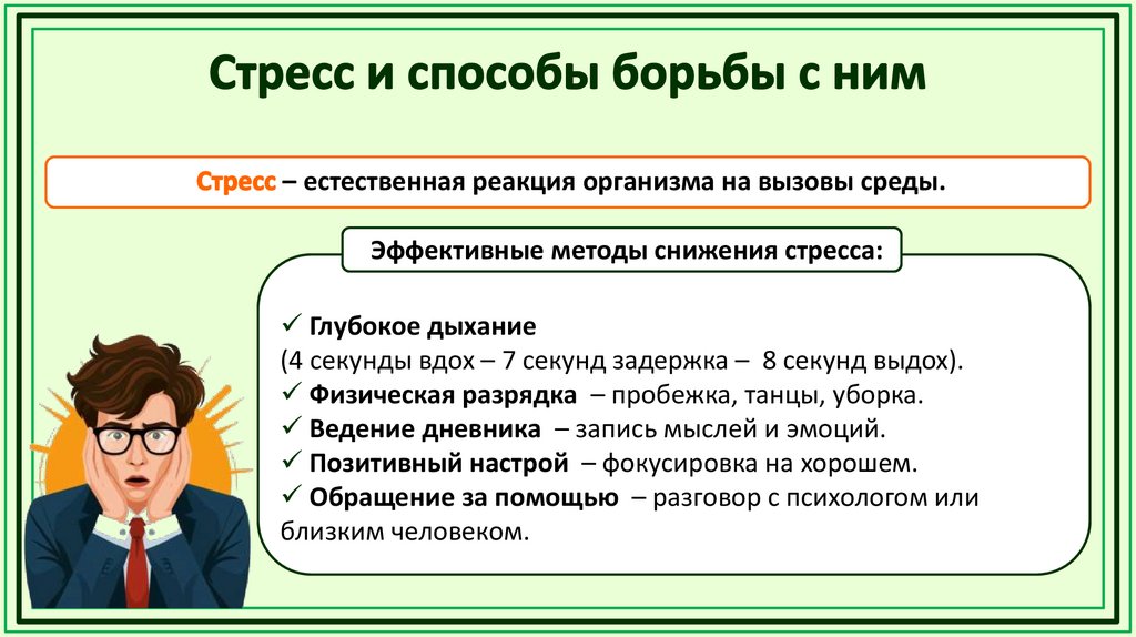 – естественная реакция организма на вызовы среды.Эффективные методы снижения стресса: