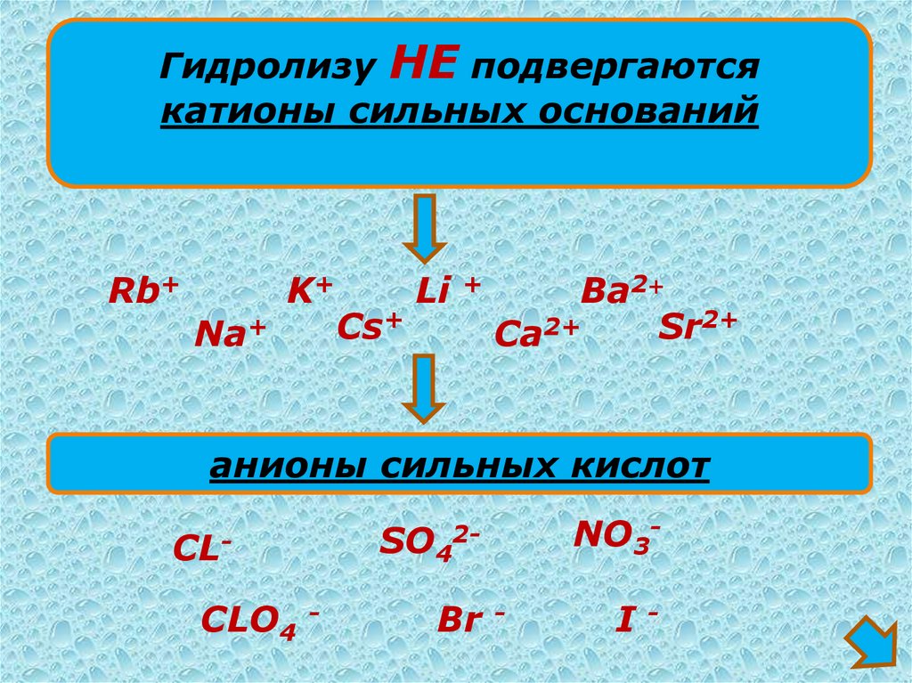 Гидролизу НЕ подвергаютсякатионы сильных оснований