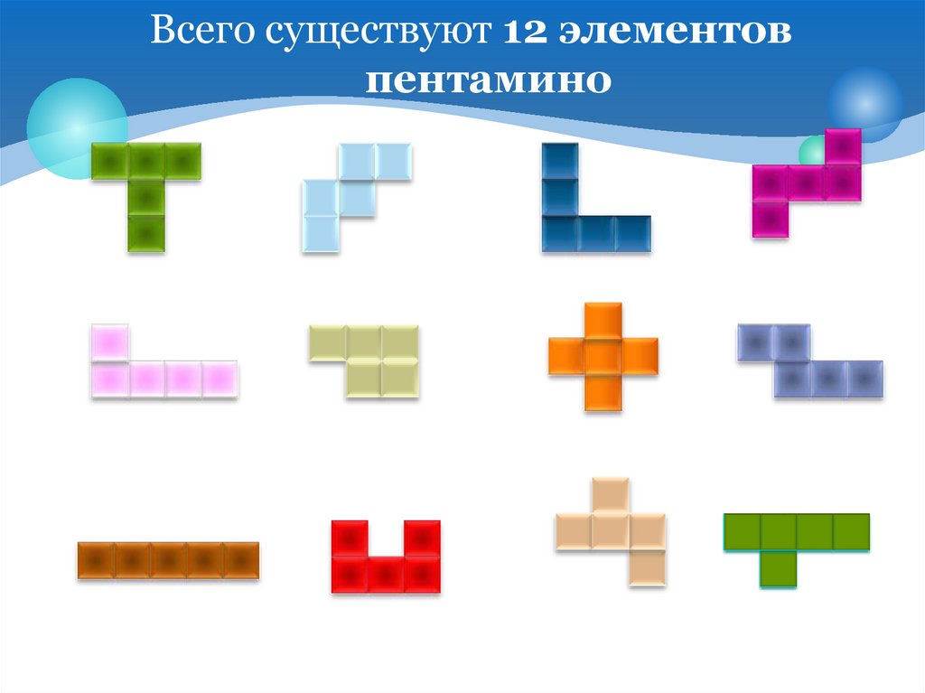 Начертить 12 фигур пентаминосо стороной квадрата, равной 2 см.