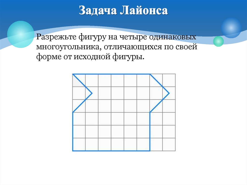 Разрежьте фигуру на четыре одинаковыхмногоугольника, отличающихся по своей