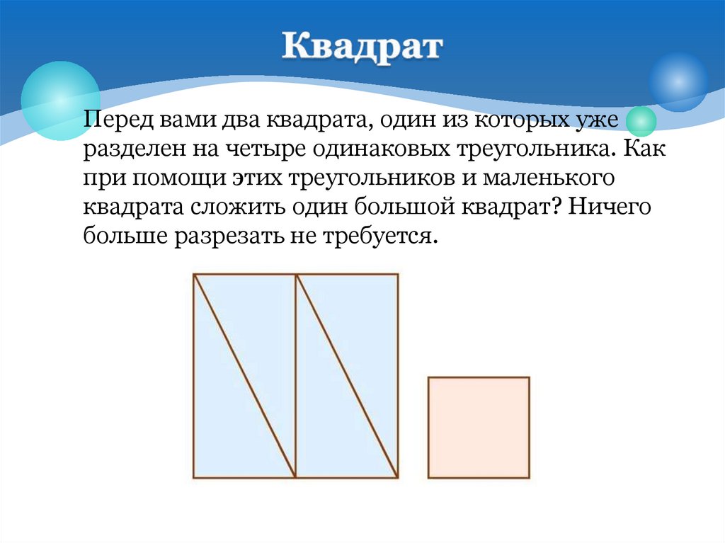Перед вами два квадрата, один из которых ужеразделен на четыре одинаковых треугольника. Как