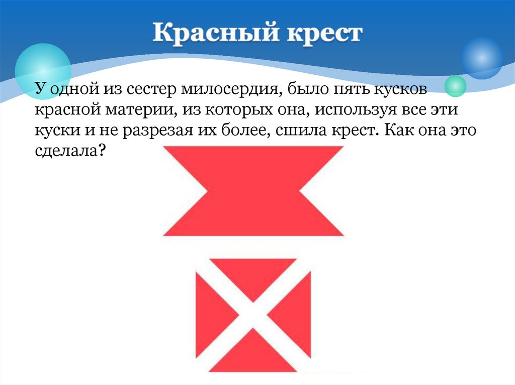 У одной из сестер милосердия, было пять кусковкрасной материи, из которых она, используя все эти