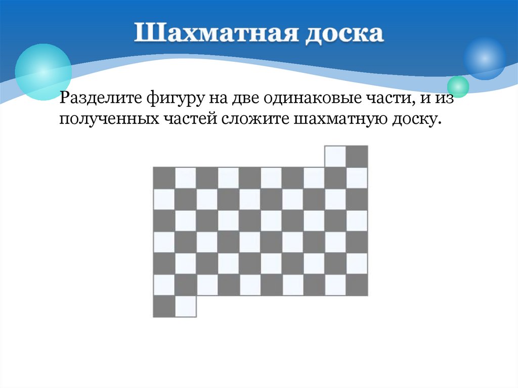 Разделите фигуру на две одинаковые части, и изполученных частей сложите шахматную доску.