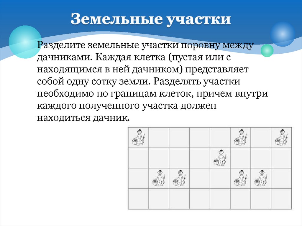 Разделите земельные участки поровну междудачниками. Каждая клетка (пустая или с