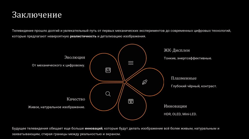 ЗаключениеТелевидение прошло долгий и увлекательный путь от первых механических экспериментов до современных цифровых технологий,