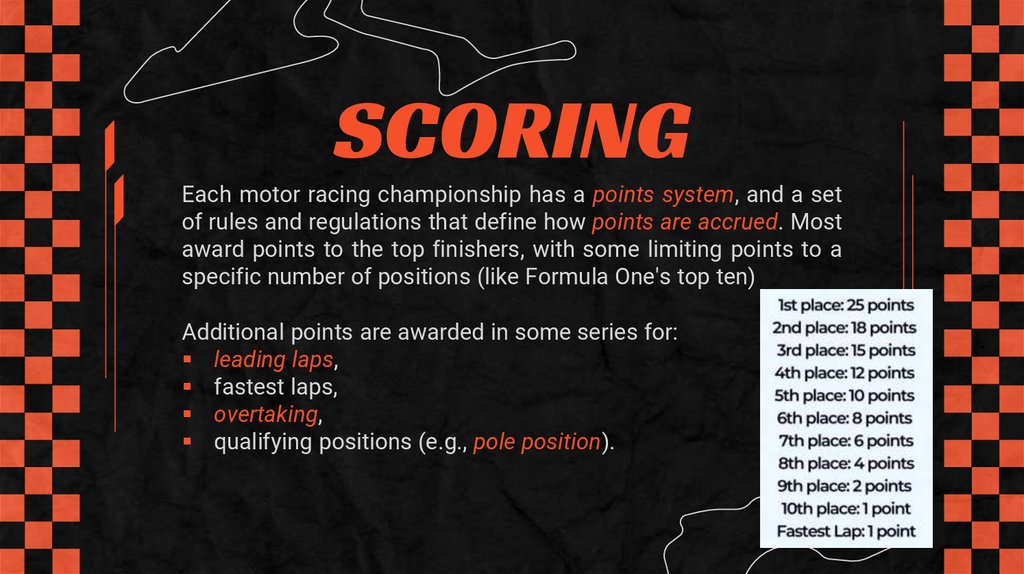 Each motor racing championship has a points system, and a setof rules and regulations that define how points are accrued. Most