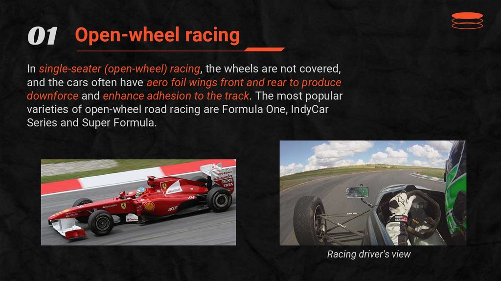 01 Open-wheel racingIn single-seater (open-wheel) racing, the wheels are not covered,