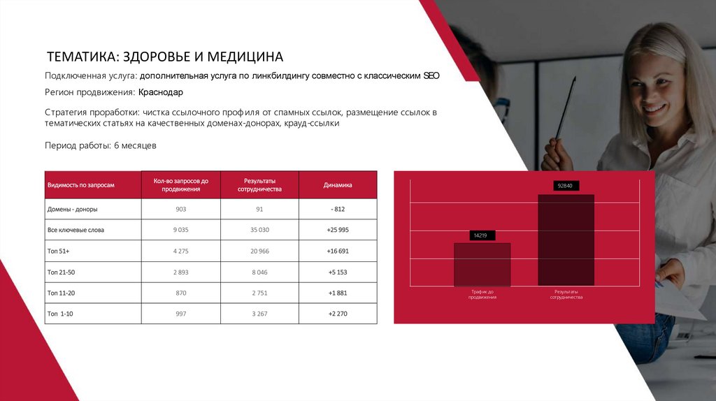 ТЕМАТИКА: ЗДОРОВЬЕ И МЕДИЦИНАПодключенная услуга: дополнительная услуга по линкбилдингу совместно с классическим SEO