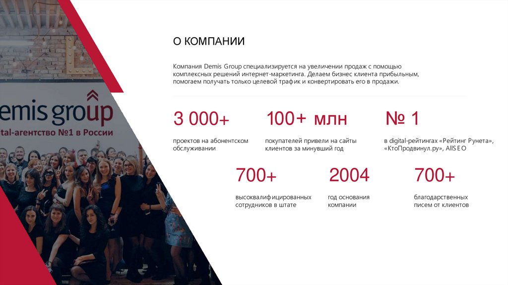 О КОМПАНИИКомпания Demis Group специализируется на увеличении продаж с помощью