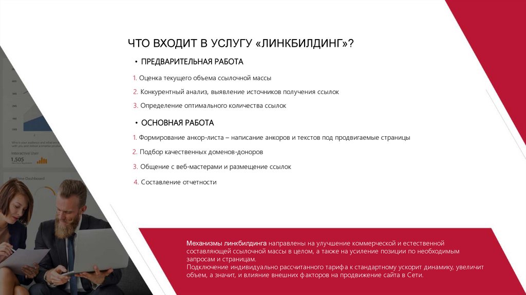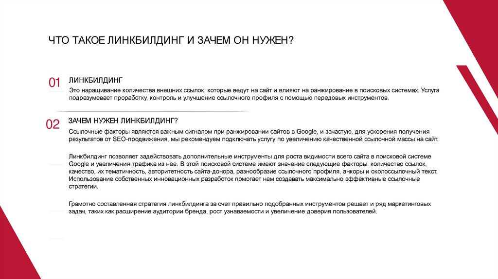 01 Это наращивание количества внешних ссылок, которые ведут на сайт и влияют на ранжирование в поисковых системах. Услуга