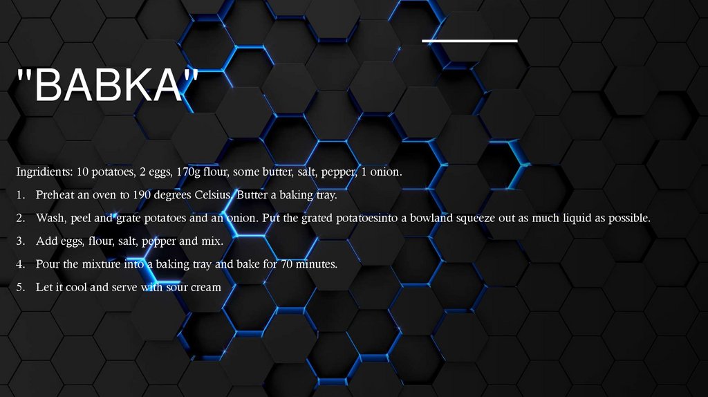 ''BABKA''Ingridients: 10 potatoes, 2 eggs, 170g flour, some butter, salt, pepper, 1 onion.