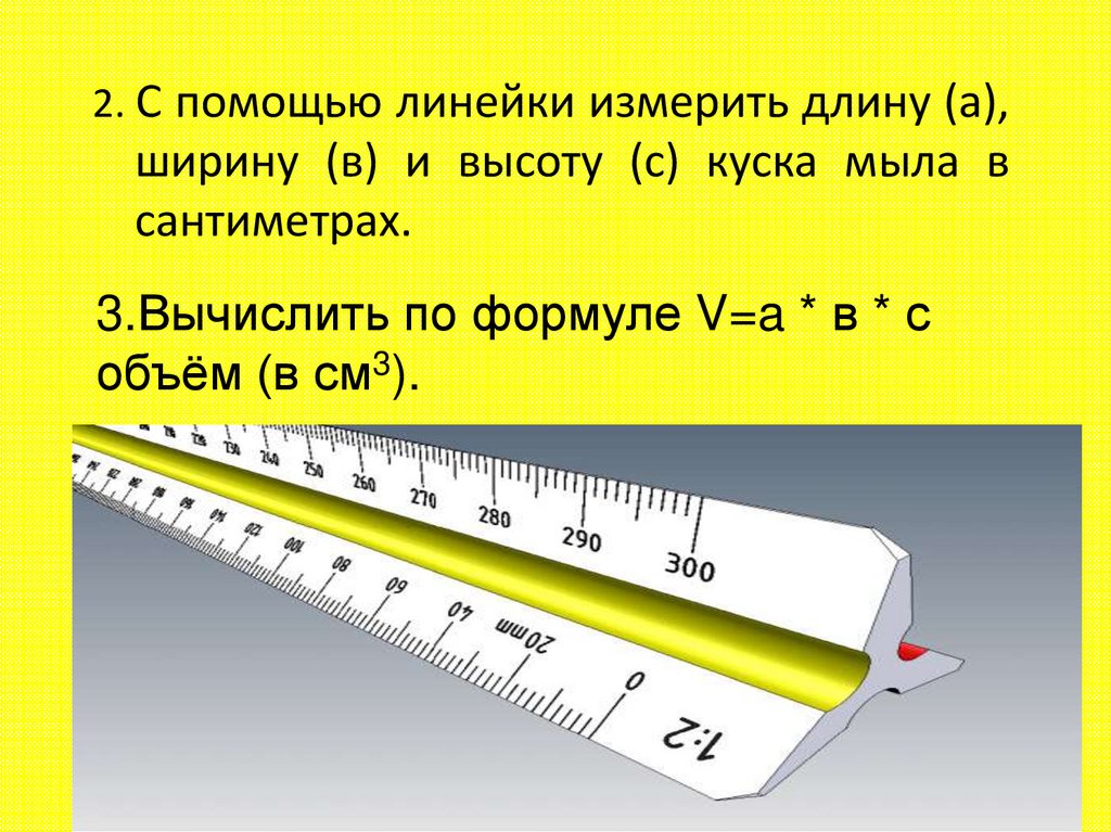 2. С помощью линейки измерить длину (а),ширину (в) и высоту (с) куска мыла в