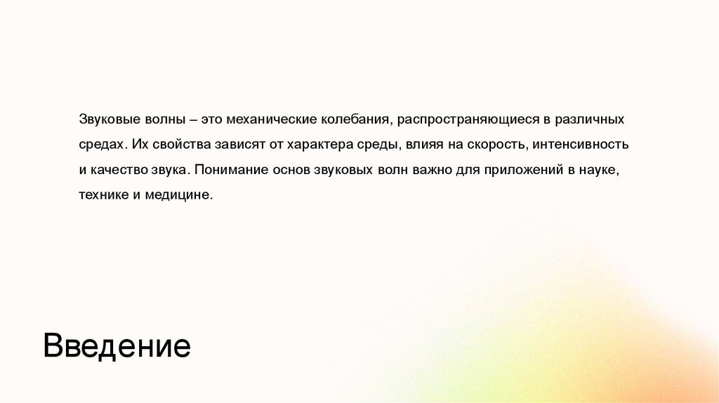 Звуковые волны – это механические колебания, распространяющиеся в различныхсредах. Их свойства зависят от характера среды, влияя на скорость, интенсивность