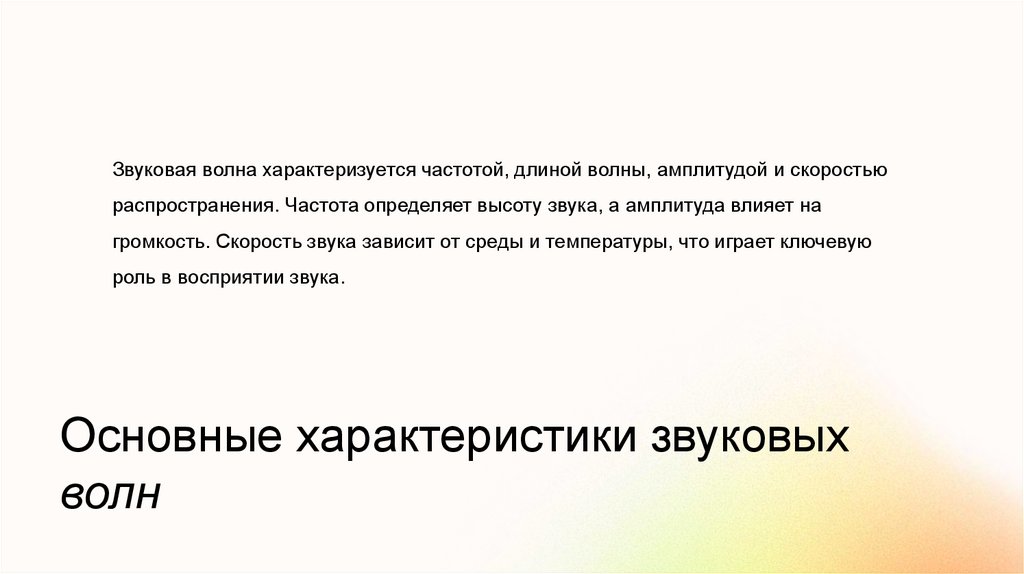 Звуковая волна характеризуется частотой, длиной волны, амплитудой и скоростьюраспространения. Частота определяет высоту звука, а амплитуда влияет на