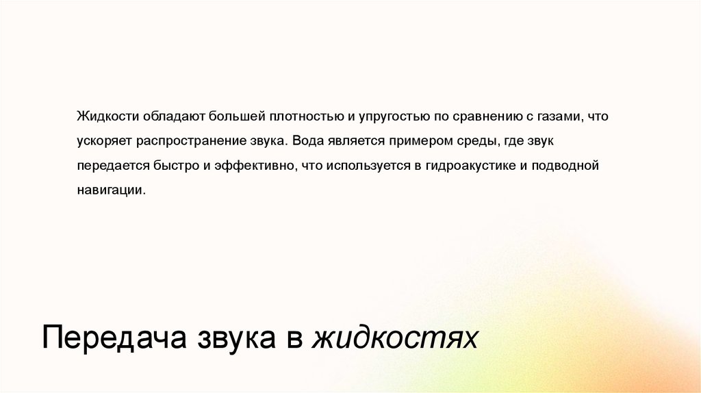 Жидкости обладают большей плотностью и упругостью по сравнению с газами, чтоускоряет распространение звука. Вода является примером среды, где звук