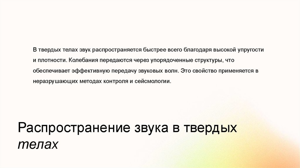 В твердых телах звук распространяется быстрее всего благодаря высокой упругостии плотности. Колебания передаются через упорядоченные структуры, что