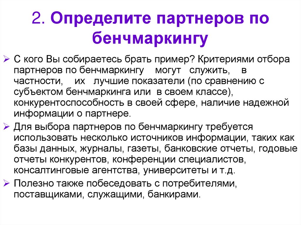 С кого Вы собираетесь брать пример? Критериями отборапартнеров по бенчмаркингу могут служить, в