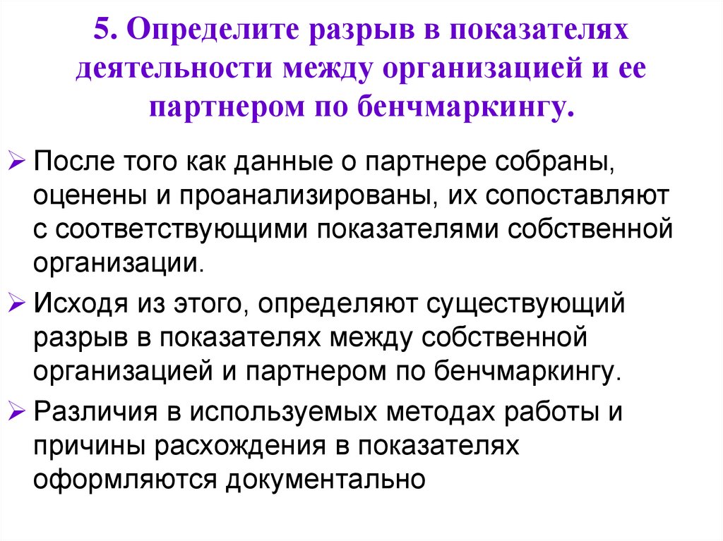 16. 5. Определите разрыв в показателях деятельности между организацией и ее партнером по бенчмаркингу.