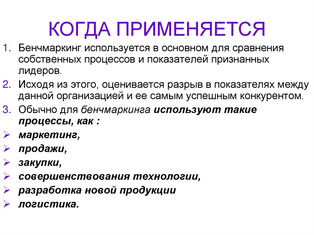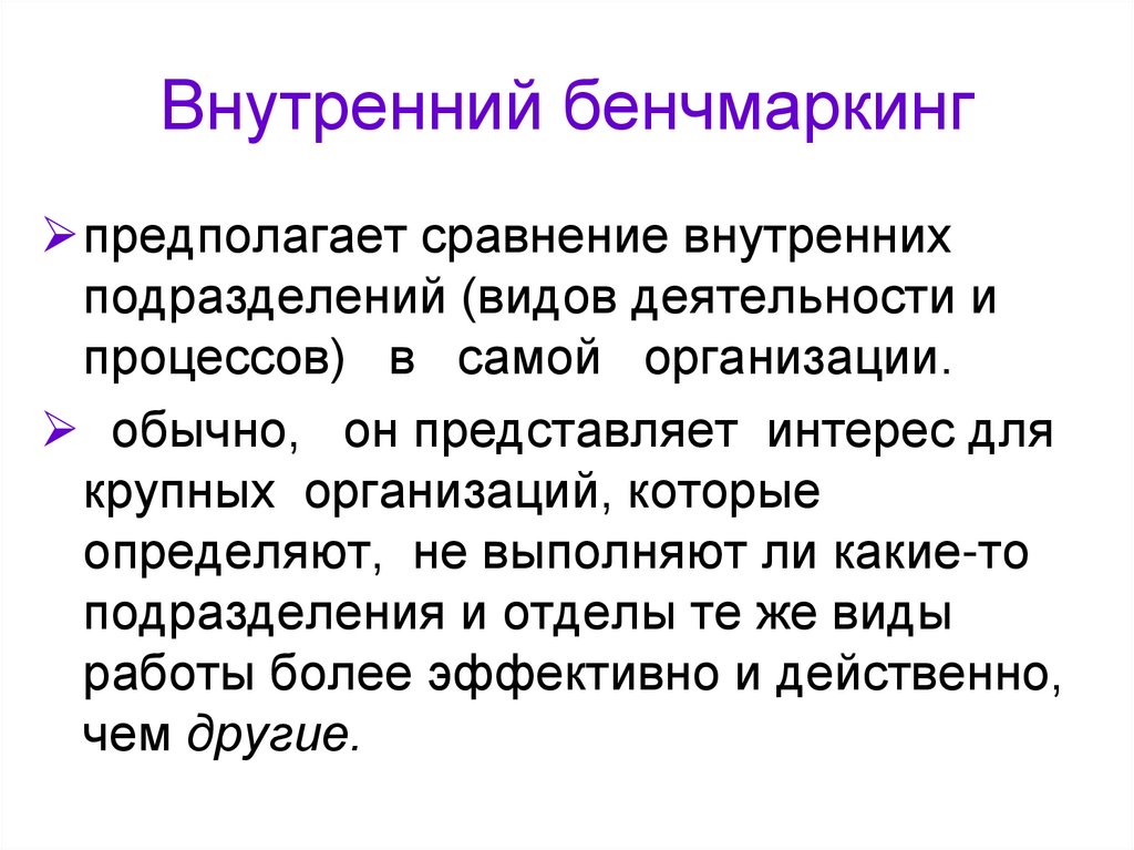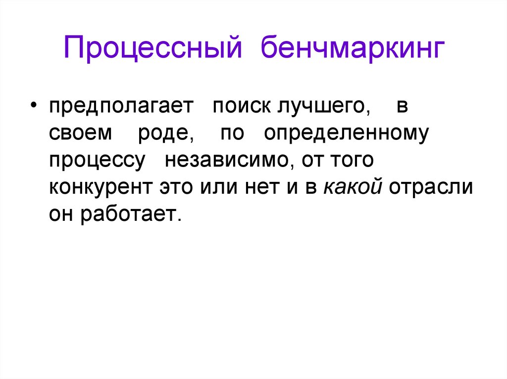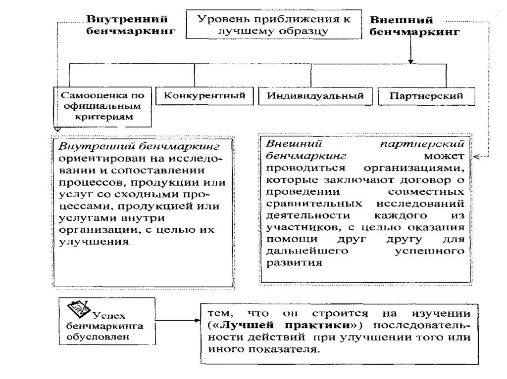 1. Бенчмаркинг используется в основном для сравнениясобственных процессов и показателей признанных