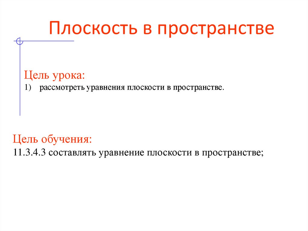 Цель урока:1) рассмотреть уравнения плоскости в пространстве.