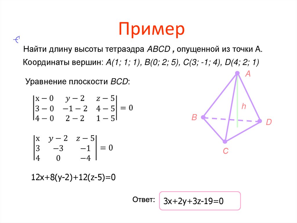Найти длину высоты тетраэдра ABCD , опущенной из точки A.Координаты вершин: A(1; 1; 1), B(0; 2; 5), C(3; -1; 4), D(4; 2; 1)