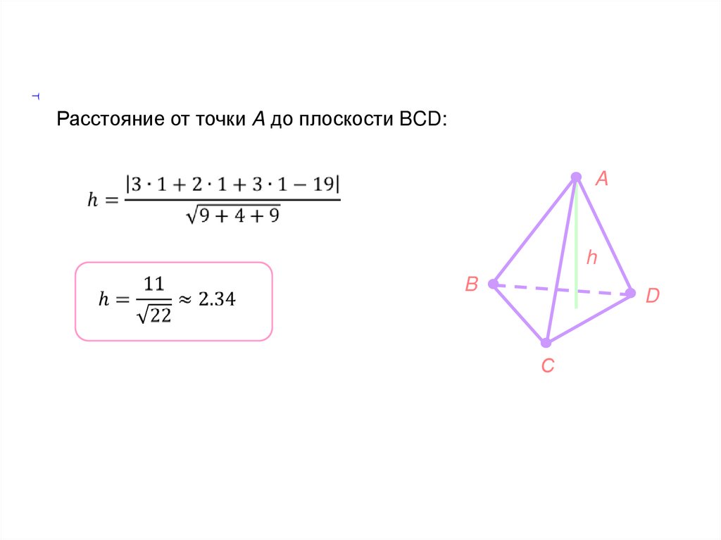 Расстояние от точки A до плоскости BCD:A