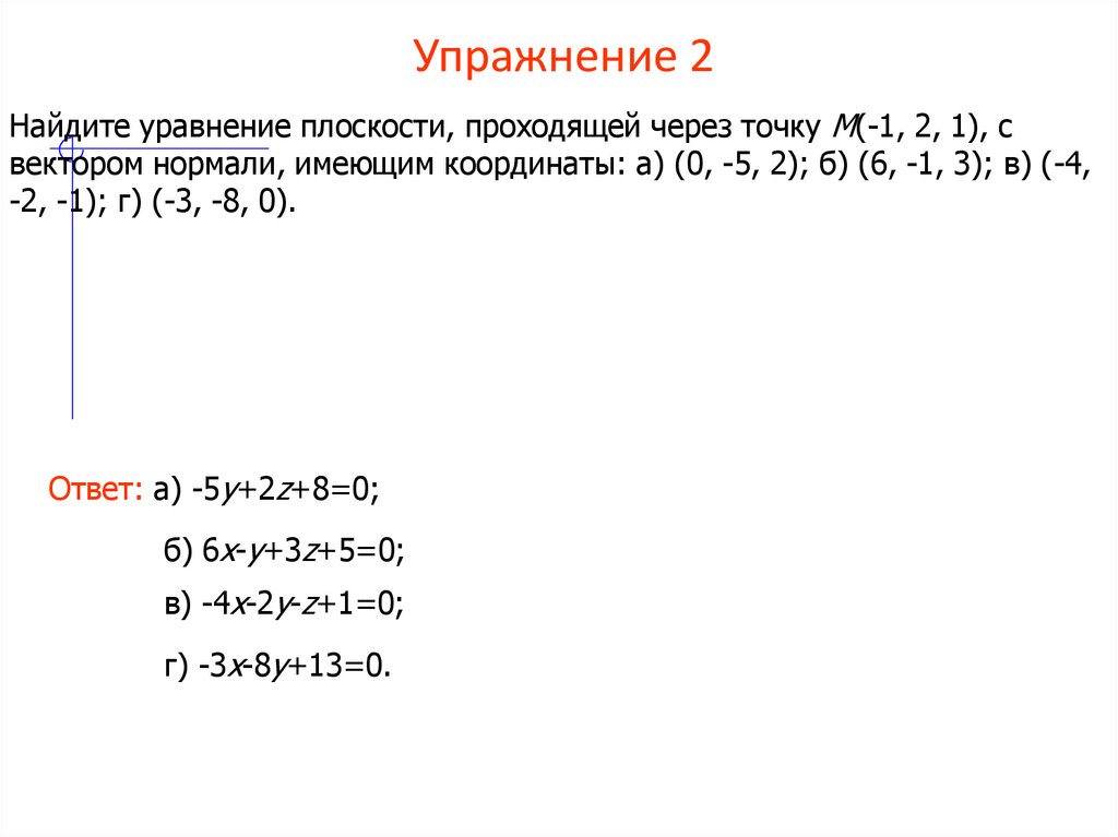 Найдите уравнение плоскости, проходящей через точку M(-1, 2, 1), свектором нормали, имеющим координаты: а) (0, -5, 2); б) (6, -1, 3); в) (-4,